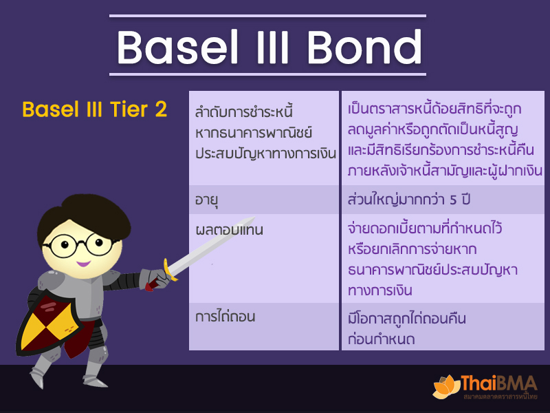 Posted by:ThaiBMA Posted on: May. 01, 2018 Share this post with Basel III Bond ตราสารหนี้ที่เพิ่มความมั่นคงให้แก่ธนาคาร ปัจจุบันธนาคารเป็นสถาบันการเงินที่ได้รับการยอมรับโดยทั่วไปว่ามีความมั่นคงขึ้นอย่างมาก ซึ่งความมั่นคงดังกล่าวไม่ได้เกิดขึ้นเอง หากแต่มีมาตรการและเครื่องมือต่างๆ มาช่วยสร้างความมั่นคงหนึ่งในเครื่องมือที่ใช้ดูแลระบบธนาคารในปัจจุบันคือ หลักเกณฑ์ Basel III ซึ่งเป็นเกณฑ์การบริหารความเสี่ยงที่นานาชาติใช้กัน หลักเกณฑ์Basel III จะมีการวัดความเสี่ยงโดยรวมของธนาคารเทียบกับเงินกองทุน ซึ่งเป็นส่วนที่ใช้รองรับความเสียงหายจากการดำเนินงานของธนาคาร โดยเงินกองทุนดังกล่าวจะประกอบด้วยเงินทุนจากหลายส่วน เช่น ทุนชำระแล้ว ทุนสำรองตามกฎหมายกำไรสะสมคงเหลือจากการจัดสรร เงินสำรองสำหรับสินทรัพย์จัดชั้นปกติ (General Provision)และเงินที่ได้จากการออกตราสารหนี้ Basel IIIหรือ Basel III Bond ดังนั้น Basel III Bond ก็คือ ตราสารหนี้ชนิดหนึ่งที่ออกโดยธนาคารพาณิชย์เพื่อนำเงินมาใช้เป็นเงินกองทุนตามหลักเกณ์ Basel III โดย Basel III Bondมีความแตกต่างจากตราสารหนี้ทั่วไปคือ จะสามารถนำไปรับความเสียหายของธนาคารได้หากมีเหตุการณ์ที่กำหนดไว้ในสัญญาเช่นอัตราส่วนเงินกองทุนต่อสินทรัพย์เสี่ยงต่ำกว่าที่กำหนด หรือ ธนาคารมีปัญหาทางการเงินทำให้ไม่สามารถดำเนินงานได้จนทางการตัดสินใจเข้าให้ความช่วยเหลือทางการเงิน เป็นต้นซึ่ง Basel III Bond จะแบ่งได้เป็น 2 ประเภท คือ ตราสารหนี้ Basel III Tier 2และตราสารหนี้ Basel III Additional Tier 1 ตราสาร Basel III Tier 2 เป็นตราสารหนี้ด้อยสิทธิ หากธนาคารประสบปัญหาทางการเงินที่ทำให้ไม่สามารถดำเนินการต่อไปได้จนทางการตัดสินใจเข้าให้ความช่วยเหลือ ตราสารหนี้เหล่านี้จะถูกเปลี่ยนเป็นหุ้นสามัญ ลดมูลค่าหรือถูกตัดเป็นหนี้สูญได้ตามที่กำหนดไว้ สำหรับนักลงทุนที่เลื่อกที่จะลงทุนในตราหนี้ประเภทนี้ ควรสามารถรับความเสียหายในกรณีเกิดวิกฤตเศรษฐกิจขนาดใหญ่เกิดขึ้นและธนาคารได้รับการช่วยเหลือจากทางการได้ ในสภาวะดังกล่าวมีโอกาสที่เจ้าหนี้รายอื่นๆ ผู้ลงทุนในตราสารหนี้อื่นๆและผู้ฝากเงินจะได้เงินคืนเต็มจำนวนแต่ นักลงทุนที่ลงทุนใน Basel III Tier 2 อาจเสียเงินทั้งหมดไป แม้ว่าหากภายหลังบริษัทได้ฟื้นตัวเข้าส่สภาวะปกติแล้วก็ตาม ส่วนที่ถูกตัดเป็นหนี้สูญแล้วจะไม่ได้คืน ดังนั้นนักลงทุนมั่นใจว่าสามารถรับความเสี่ยงที่จะขาดทุนจำนวนมากได้หากต้องการลงทุนในตราสารประเภทนี้ ปัจจุบันธนาคารหลายแห่งได้ออกตราสารหนี้ประเภทนี้ออกมาซึ่งได้รับความนิยมจากนักลงทุนเนื่องจากการจ่ายดอกเบี้ยที่สูง และนักลงทุนเชื่อมั่นในความมั่นคงของธนา