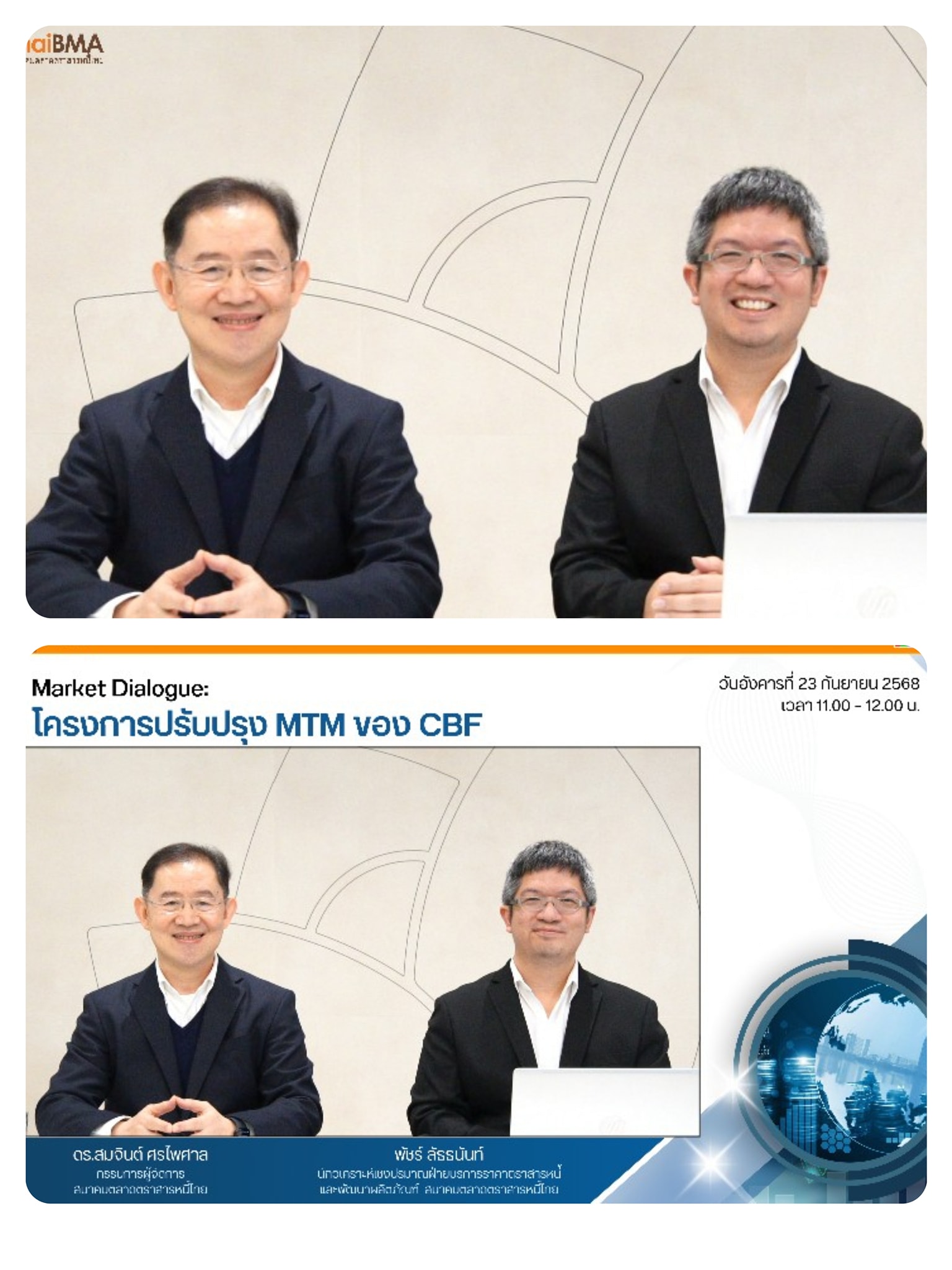 ThaiBMA Gallery Market Dialogue เรื่อง “โครงการปรับปรุง MTM ของ CBF 🙏 ThaiBMA ขอขอบคุณผู้ร่วมตลาดทุกภาคส่วนที่ให้ความสนใจและเข้าร่วม Market Dialogue เรื่อง “โครงการปรับปรุง MTM ของ CBF (พันธบัตร ธปท. ประเภทอัตราดอกเบี้ยลอยตัว อิงอัตราดอกเบี้ยอ้างอิง THOR รุ่นอายุไม่เกิน 1 ปี)” 📅 ที่ได้จัดขึ้นในวันนี้ (23 กันยายน 2568 เวลา 11.00 – 12.00 น.) ขอบคุณทุกท่านที่เข้าร่วม และแลกเปลี่ยนความคิดเห็น ร่วมซักถามข้อมูลอันเป็นประโยชน์ Back to Main Gallery